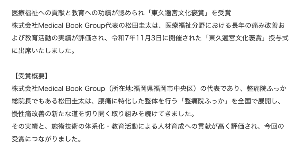 今回の受賞を記念し、通常12,000円(税込)の初回施術を1,980円(税込)で体験できる「東久邇宮文化褒賞 受賞記念キャンペーン」を全院で開催します。