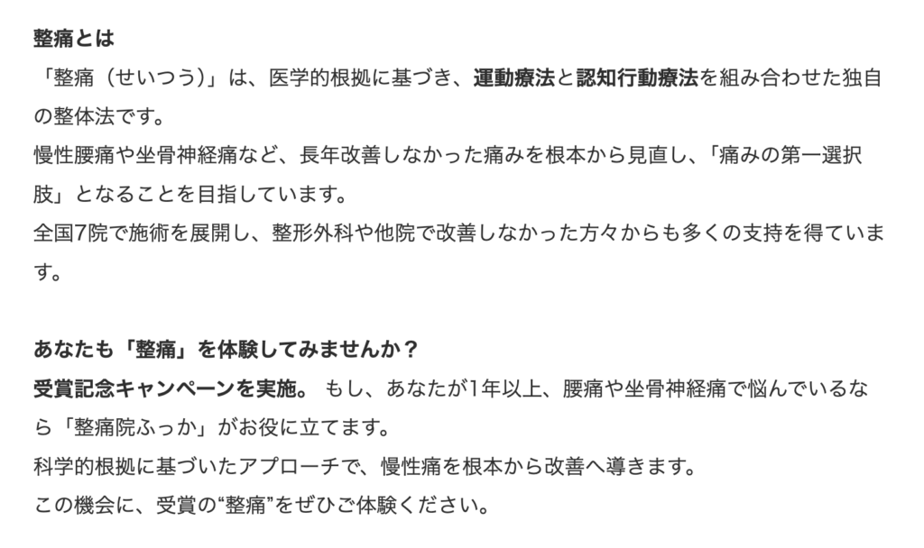 受賞の“整痛”を体験できるキャンペーンを開催。